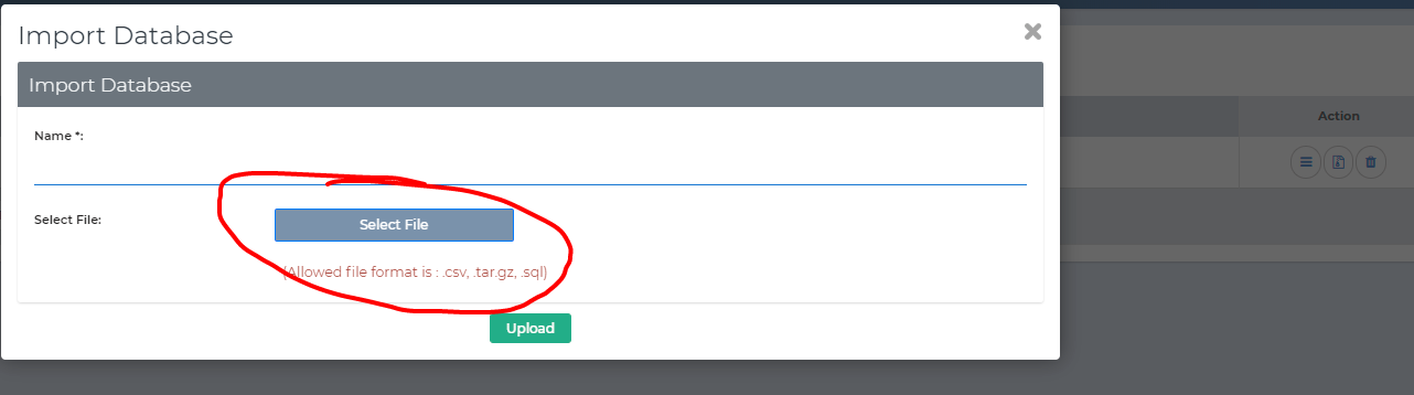 Configuration-> Database Backup -> Import -> Select File button is not working and will not open the window to select a local file for upload.